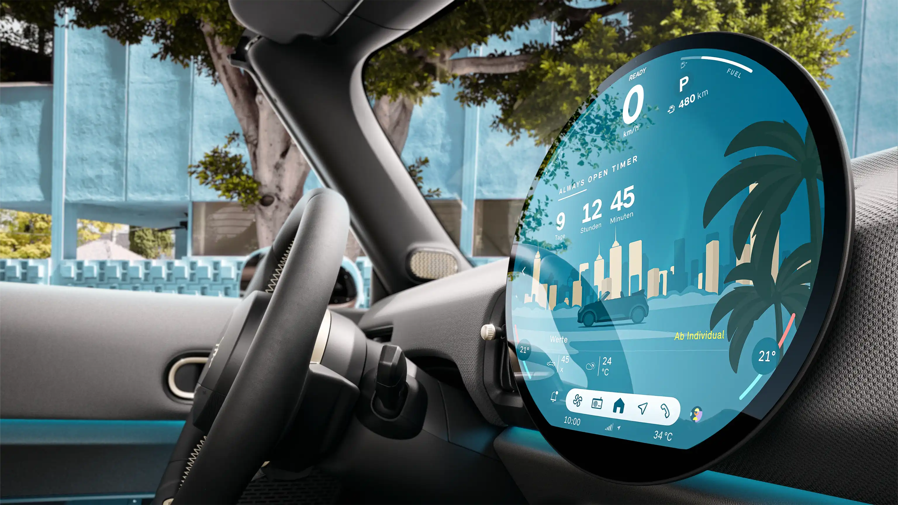 Ikonický centrálny displej s priemerom 240 mm a vysoko kvalitným sklom je vaším prístrojovým panelom aj palubným informačným, zábavným a asistenčným strediskom. Zároveň je to celosvetovo prvý displej kruhového tvaru.